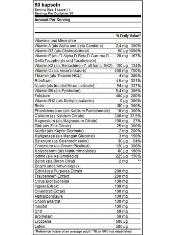 Calciumcitrat, Magnesiumcitrat, Vitamin C (als L‑Ascorbinsäure), Echinacea purpurea‑Extrakt, Traubenkernextrakt, Zinkcitrat, Citrus‑Bioflavonoide, Ingwer‑Extrakt, Olivenblatt‑Extrakt, Alpha‑Liponsäure, Cholinbitartrat, Inositol, Niacin (als Inositol‑Hexanicotinat), Bromelain, Q10, Vitamin E (als Mischung von D‑Alpha, Beta, Gamma, Delta‑Tocopherylen/-trienolen), Pantothensäure (als Calcium‑Pantothenat), Vitamin B6 (als Pyridoxinhydrochlorid), Eisen (als Eisen‑Bisglycinat), Riboflavin, Thiamin (als Thiaminhydrochlorid), Mangan (als Mangan‑Gluconat), Vitamin A (als Alpha+Beta‑Carotin), Kupfer (als Kupfer‑Glycinat), Bor (als Bor‑Citrat), Vitamin D3 (als Cholecalciferol), Lutein, Lycopin, Folsäure, Jod (als Kaliumjodid), Biotin, Chrom (als Chrom‑Picolinat), Vitamin K2 (all‑trans MK‑7), Molybdän (als Natriummolybdat), Selen (als Selenmethionin), Trennmittel (Reiskleieextrakt), Kapselhülle: Hydroxypropylmethylcellulose.