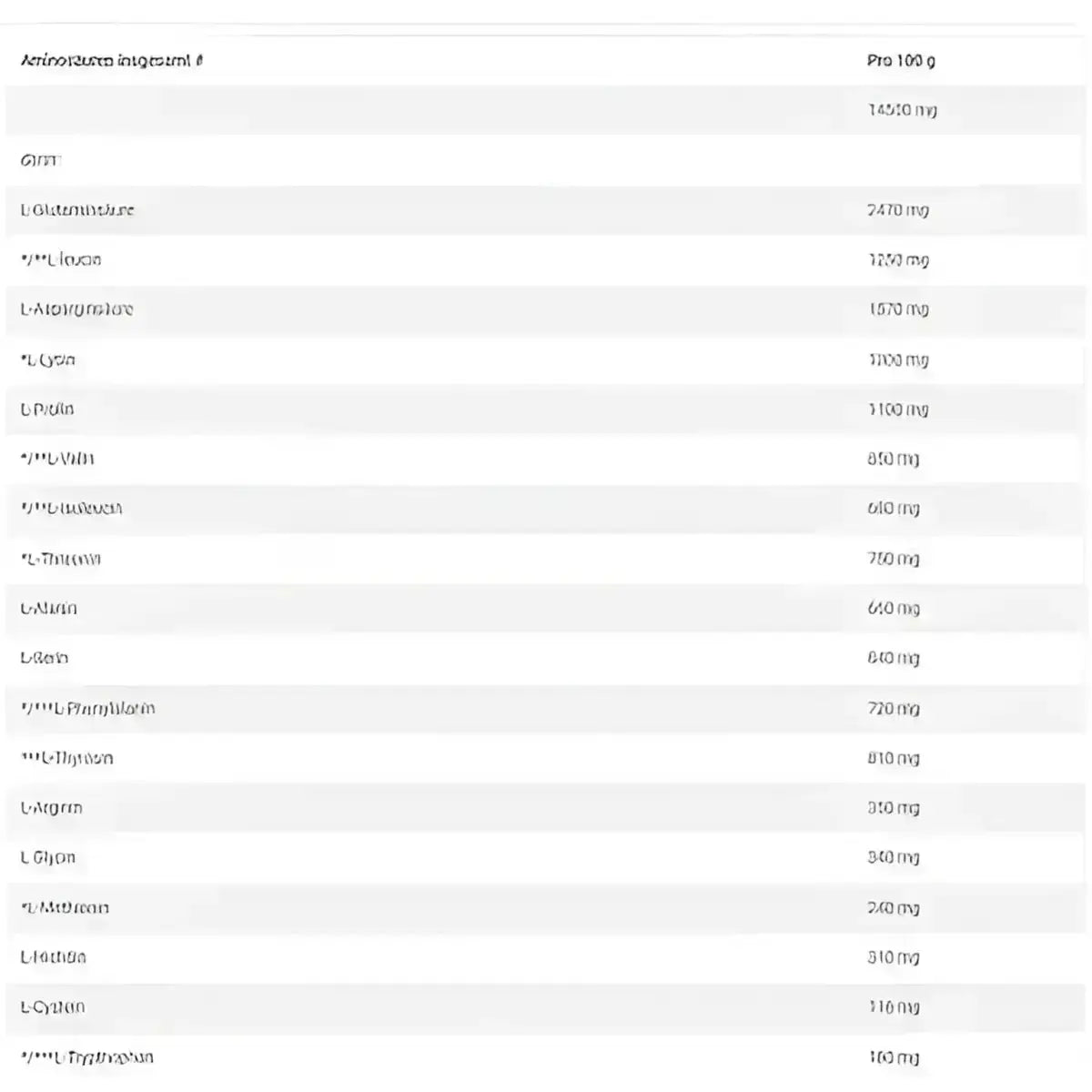 Zutaten: 80% Kohlenhydrate-Mix (Maltodextrin, Dextrose), 15,5% Eiweißerzeugnisse (Molkeneiweißkonzentrat, mizellares Kasein, ultrafiltriertes Ovalbumine), Aromen, 1,5% Creatinmonohydrat, 0,5% Taurin, Säureregulator - Apfelsäure, Verdickungsmittel - Xanthan, Carboxymethylcellulose; 0,01% Vitamine (L-Ascorbinsäure – Vit. C (4 mg - 5% RDA*), DL-alpha-Tocopherylacetat – Vit. E (0,6 mg - 5% RDA*), Nicotinamid – Niacin (0,8 mg - 5% RDA*), D-Biotin (2,5 µg – 5% RDA*), Retinylacetat – Vit. A (40 µg - 5% RDA*), Calcium-D-pantothenat – Pantothensäure (0,3 mg - 5% RDA*), Pyridoxinhydrochlorid – Vit. B6 (0,1 mg - 5% RDA*), Cholecalciferol – Vit. D (0,25 µg - 5% RDA*), Pteroylmonoglutaminsäure – Folat (10 µg - 5% RDA*), Thiaminmononitrat – Vit. B1 (0,05 mg - 5% RDA*), Riboflavin – Vit. B2 (0,07 mg - 5% RDA*), Cyanocobalamin – Vit. B12 (0,13 µg - 5% RDA*)), Farbstoffe: Karmin (bei Geschmack: Erdbeere, Kirsche, Erdbeere-Kiwi, Banana-Kirsche), E 150c (bei Geschmack: Toffee, Schoko, Kaffee, Eiskaffee, Haselnuss, Cappuccino, Tiramisu), Riboflavin, E 133 (für Pistaziengeschmack).