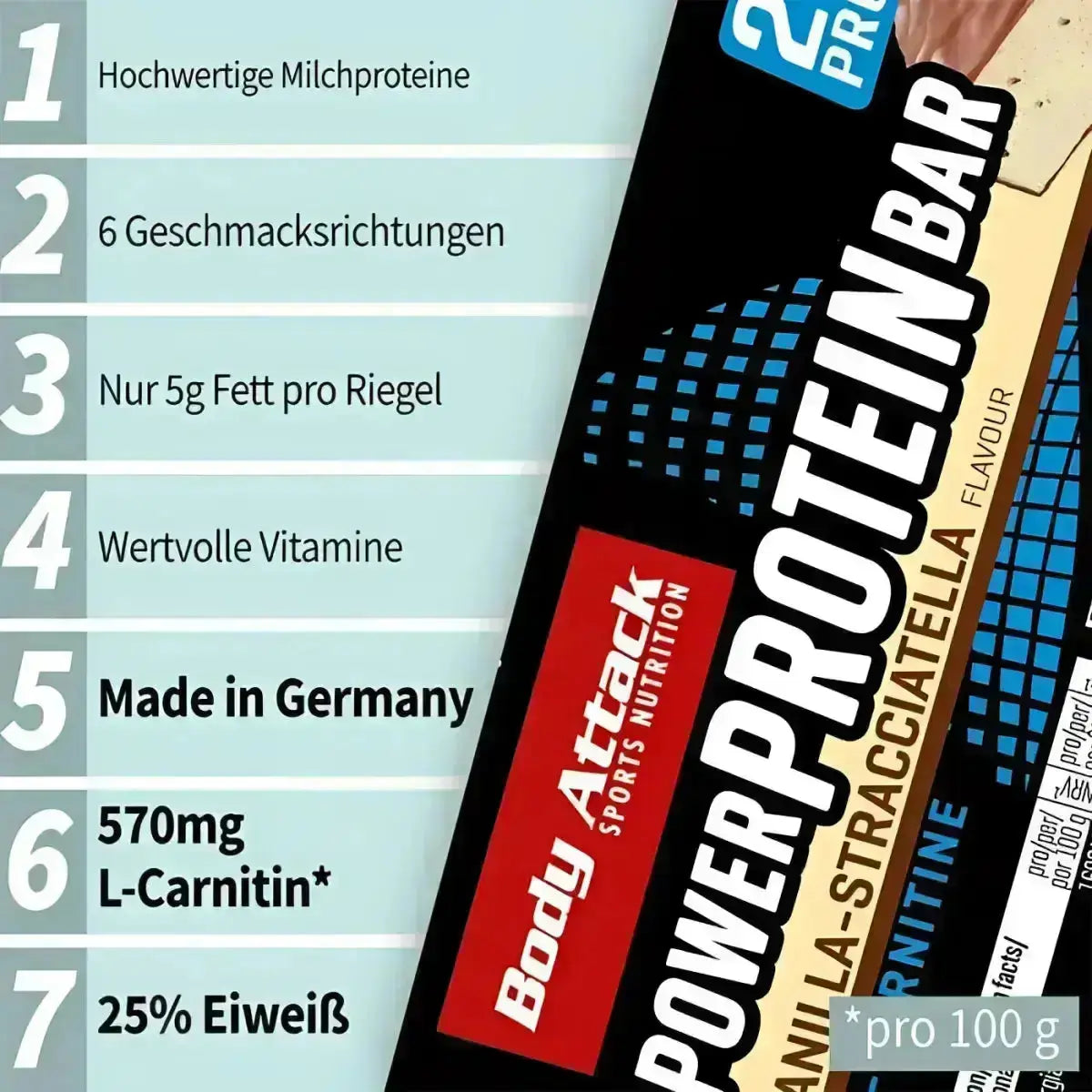Proteine zum Anbeißen. Umhüllt von knackiger Schokolade macht der POWER PROTEIN-BAR seinem Namen alle Ehre. Satte 25 % hochwertiges Milcheiweiß sind zum Erhalt der Muskeln in jedem Riegel enthalten. Auch als Kraftpaket schlägt sich unsere Köstlichkeit hervorragend durch den Anteil an Kohlenhydraten. Je Protein Bar stehen dir direkt nach dem Training 16 g schnell verfügbare Kohlenhydrate zur Verfügung.