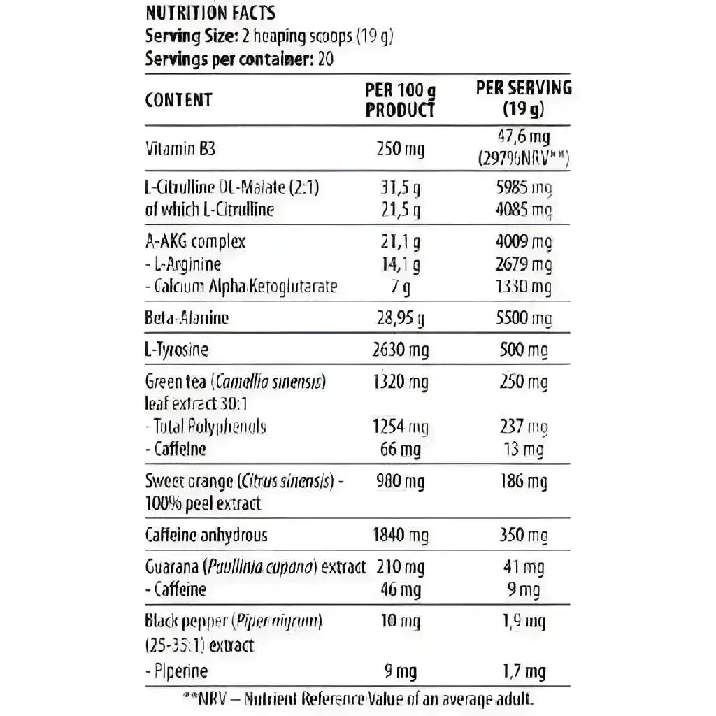 Die Blood and Guts-Formel von Dorian Yates stellt die Intensität in den Vordergrund Ihrer Trainingseinheiten. Von der allerersten Portion an tritt eine schnelle Infusion mentaler Stimulanzien ein und bringt Ihre Neurotransmitter in Schwung. Ihr Fokus und Ihre Konzentration verbessern sich deutlich, da Guarana-Samenextrakt, Koffein, L-Tyrosin und Grüntee-Extrakt Ihren mentalen Zustand verstärken. Während Sie sich mit beispiellosem Tunnelblick aufwärmen, werden Sie spüren, wie die nächste Welle von Inhaltsstoffen jede Muskelfaser in Ihrem Körper verschlingt: Citrullin-Malat, Beta-Alanin und Arginin-AKG sorgen zusammen für eine bessere Durchblutung der arbeitenden Muskeln, verlängern die Ausdauer und sprengen Sie die Gesamtstärke durch das Dach.