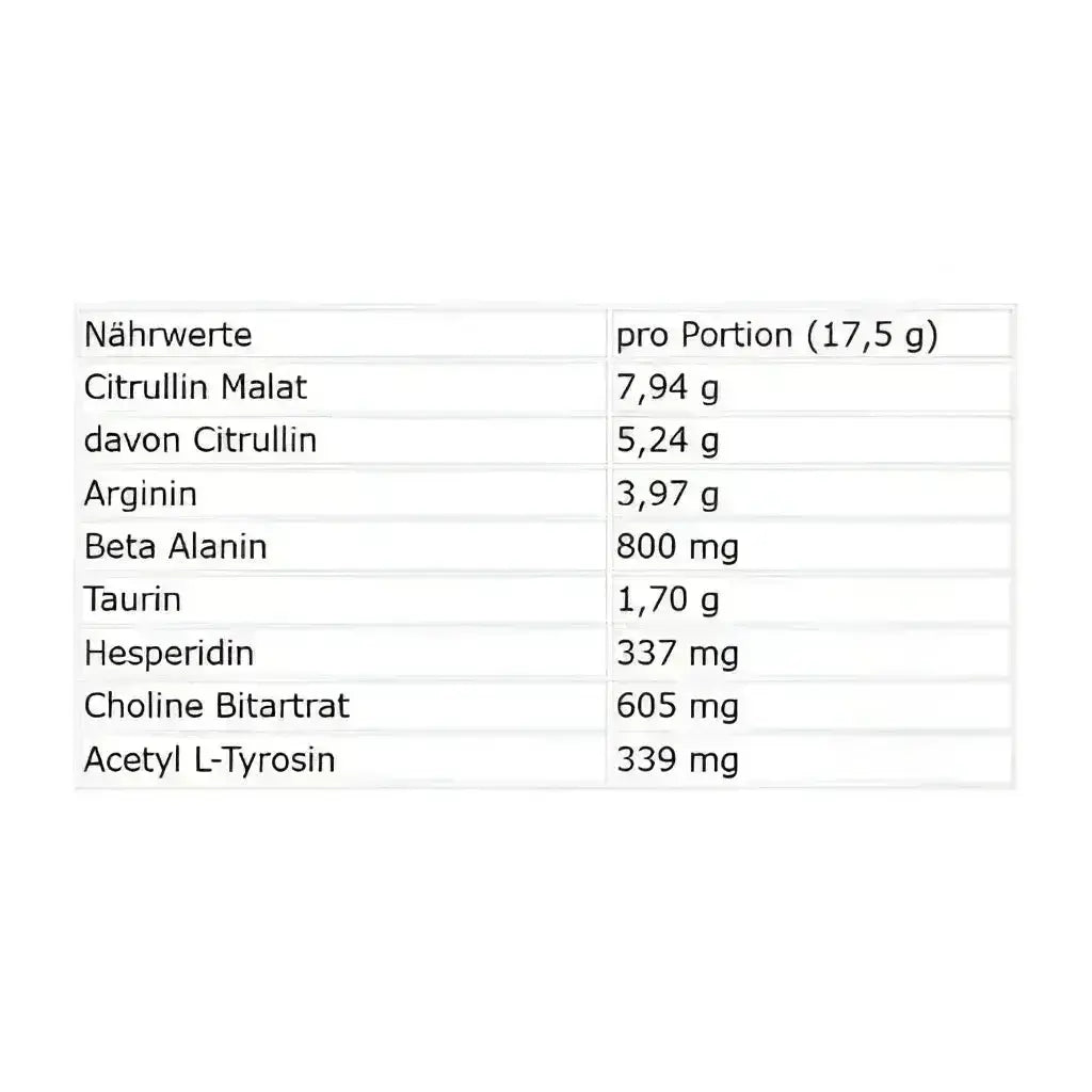 L-Citrullin, Beta-Alanin, L-Arginin, Taurin, L-Tyrosin, Inositol, Vitamin C, Vitamin B6, Magnesiumcitrat, Natriumcitrat, Kaliumcitrat, Aroma, Süßungsmittel (Sucralose, Acesulfam K), Farbstoffe (je nach Geschmacksrichtung).