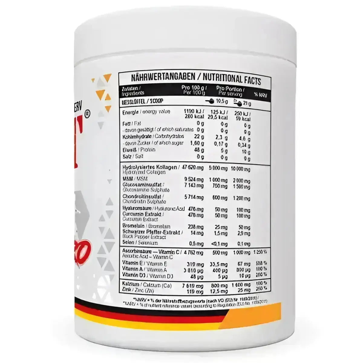 Hydrolysiertes Kollagen (aus Rind), Calciumsalze der Orthophosphorsäure, Methylsulfonylmethan (MSM), Glucosaminsulfat (aus Schalentieren), Chondroitinsulfat, L-Ascorbinsäure (Vitamin C), Säuerungsmittel (Zitronensäure), Aroma, Antischaummittel (Siliciumdioxid), DL-alpha-Tocopherylacetat (Vitamin E), Süßungsmittel (Sucralose), Kurkuma-Wurzelextrakt (standardisiert auf 95 % Curcumin), Bromelain (aus Ananas comosus 1200 GDU/g), Hyaluronsäure, Zinkoxid, Farbstoffe (Beta-Carotin, Indigotin), Retinylacetat (Vitamin A), Cholecalciferol (Vitamin D3), Schwarzer Pfeffer-Extrakt (standardisiert auf 95 % Piperin), Natriumselenit.