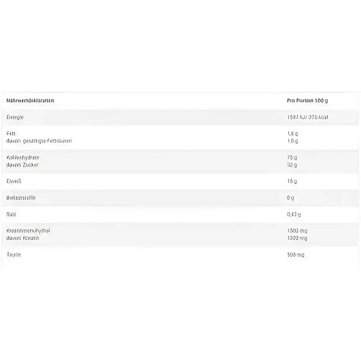 Zutaten: 80% Kohlenhydrate-Mix (Maltodextrin, Dextrose), 15,5% Eiweißerzeugnisse (Molkeneiweißkonzentrat, mizellares Kasein, ultrafiltriertes Ovalbumine), Aromen, 1,5% Creatinmonohydrat, 0,5% Taurin, Säureregulator - Apfelsäure, Verdickungsmittel - Xanthan, Carboxymethylcellulose; 0,01% Vitamine (L-Ascorbinsäure – Vit. C (4 mg - 5% RDA*), DL-alpha-Tocopherylacetat – Vit. E (0,6 mg - 5% RDA*),  Nicotinamid – Niacin (0,8 mg - 5% RDA*), D-Biotin (2,5 µg – 5% RDA*), Retinylacetat – Vit. A (40 µg - 5% RDA*), Calcium-D-pantothenat – Pantothensäure (0,3 mg - 5% RDA*), Pyridoxinhydrochlorid – Vit. B6 (0,1 mg - 5% RDA*), Cholecalciferol – Vit. D (0,25 µg - 5% RDA*), Pteroylmonoglutaminsäure – Folat (10 µg - 5% RDA*), Thiaminmononitrat – Vit. B1 (0,05 mg - 5% RDA*), Riboflavin – Vit. B2  (0,07 mg - 5% RDA*), Cyanocobalamin – Vit. B12 (0,13 µg - 5% RDA*)), Farbstoffe: Karmin (bei Geschmack: Erdbeere, Kirsche, Erdbeere-Kiwi, Banana-Kirsche), E 150c (bei Geschmack: Toffee, Schoko, Kaffee, Eiskaffee, Haselnuss, Cappuccino, Tiramisu), Riboflavin, E 133 (für Pistaziengeschmack).