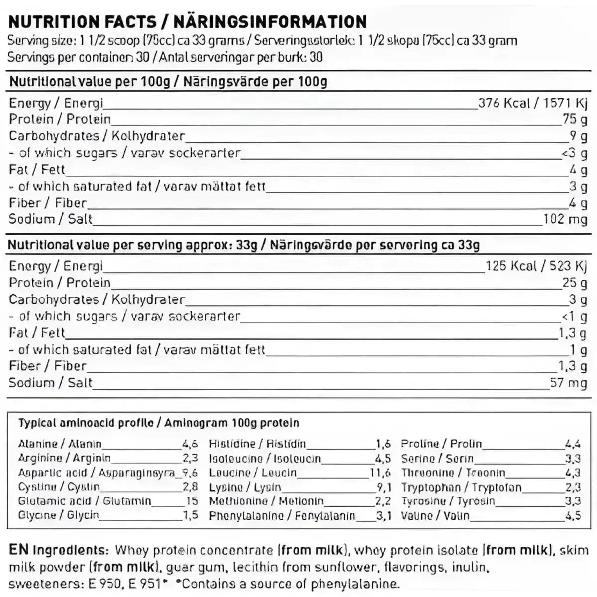Swedish Supplements Whey Protein Deluxe besteht aus hochwertigem Molkenprotein, wobei Konzentrate und Isolate gemischt werden. Molkenprotein hat einen vollständigen Gehalt an lebenswichtigen Aminosäuren und einen natürlich hohen Gehalt an den muskelaufbauenden verzweigten Aminosäuren. Die hohe Qualität von Molke macht es zu einer der herausragenden Proteinsorten, wenn es um die Maximierung des Muskelaufbaus geht.