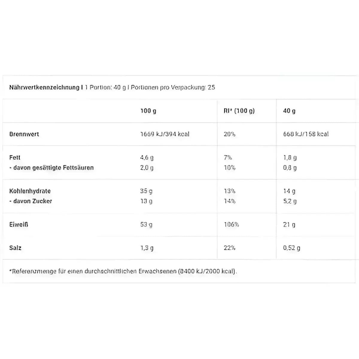 Reismehl, Molkenproteinkonzentrat [Molkenproteinkonzentrat, Emulgator: Lecithine (Soja)], hydrolysiertes Eiweiß, Volleipulver, Calciumcaseinat (enthält Milch), Magermilchpulver, fettarmes Kakaopulver, Eiklar pulver, Aromen, Backpulver [Backtriebmittel (Natriumcarbonate, Diphosphate), Maisstärke], Backtriebmittel (Natriumcarbonate), Verdickungs- mittel (Xanthan), Süßungsmittel (Sucralose).