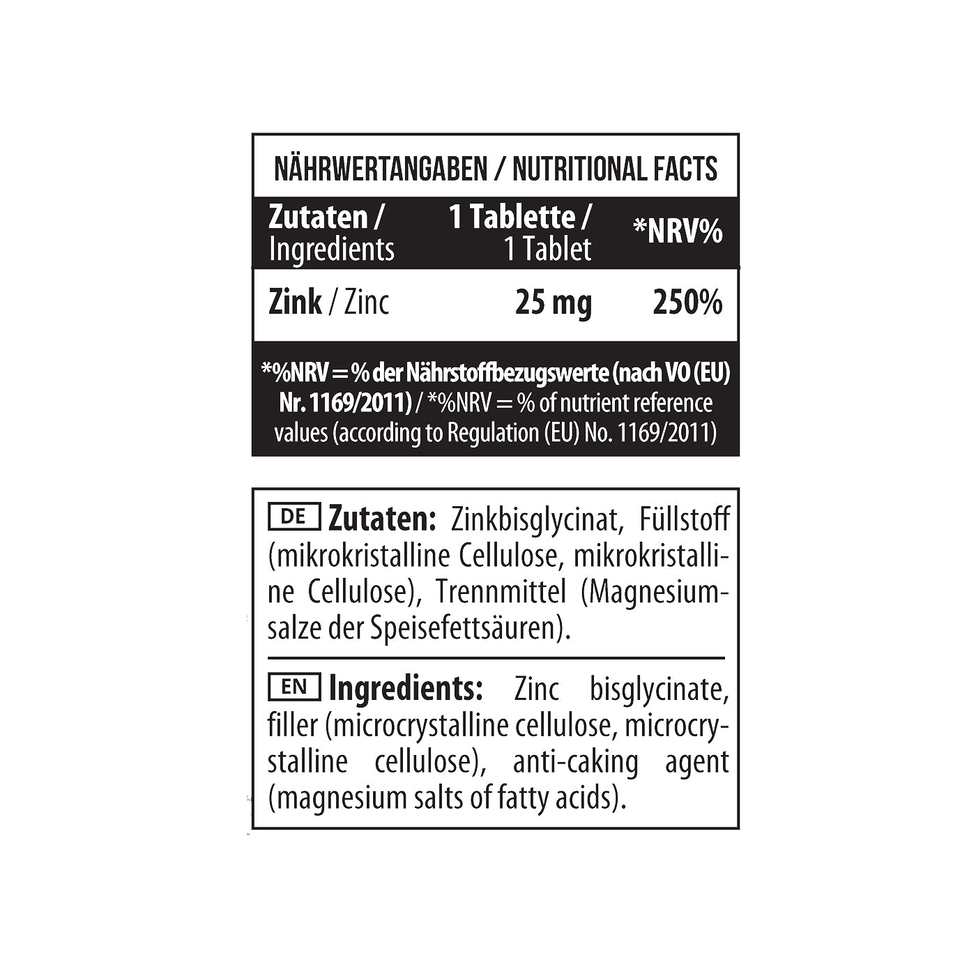 Zink Bisglycinat, Füllstoff (mikrokristalline Cellulose), Antibackmittel (Magnesiumsalze von Speisefettsäuren)